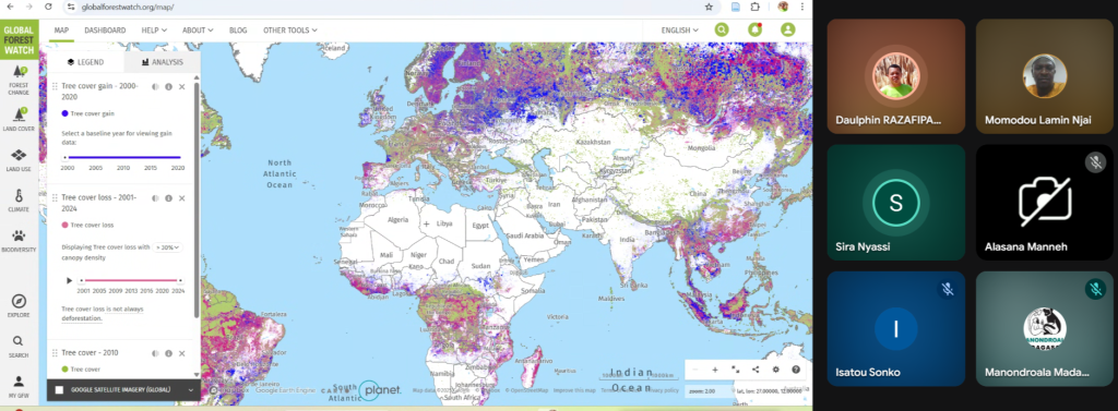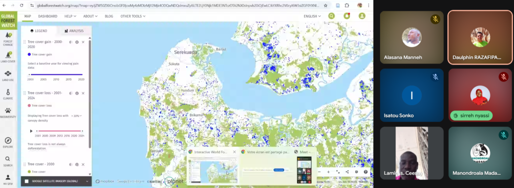 Englanninkielinen koulutus Gambian viranomaisille keskittyi QGIS:n perusteiden vahvistamiseen ja käytännön taitojen kehittämiseen metsien seurannassa. Osallistujat oppivat vaiheittain tuomaan ja järjestämään dataa, visualisoimaan puuston muutoksia ja metsäkatoa, tulkitsemaan satelliittipohjaisia palohälytyksiä sekä laatimaan karttoja, joita voi käyttää raportoinnissa ja kenttätyössä. Suurin osa koulutuksesta painottui ohjelmiston käyttöön, käyttöliittymien hallintaan, rasteri- ja vektoritiedostojen käsittelyyn sekä työnkulkujen seuraamiseen, joiden avulla raakadata muuttuu maantieteelliseksi dataksi. Koulutusten avulla osallistujat pystyivät ottamaan paikkatietotyökalut käyttöön päivittäisessä metsien seurannassa.